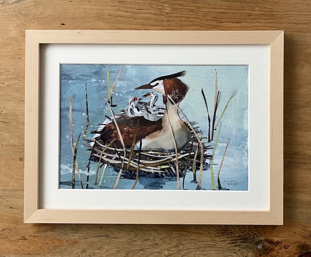 Geat Crested Grebe with its Chicks – collage and paint on paper in a light coloured wooden frame. it measures 300mm x 400mm