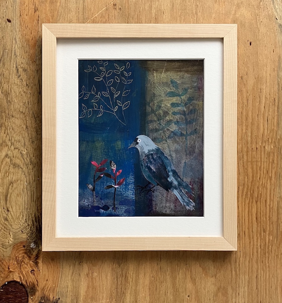 Collage and paint on paper in a light coloured wooden frame. Created in 2022 –  it measures 250mm x 350mm