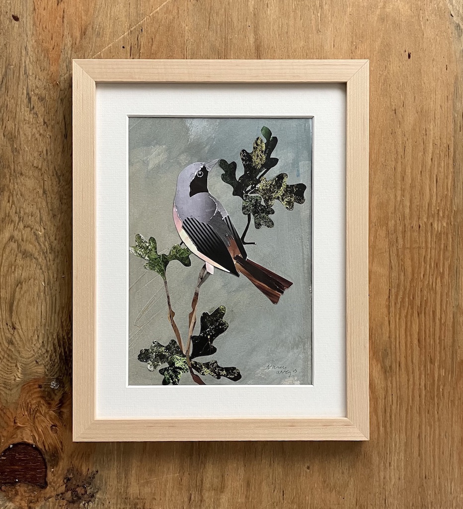 Redstart – collage and paint on paper in a light coloured wooden frame. It measures 280mm x 360mm and was created in 2021
