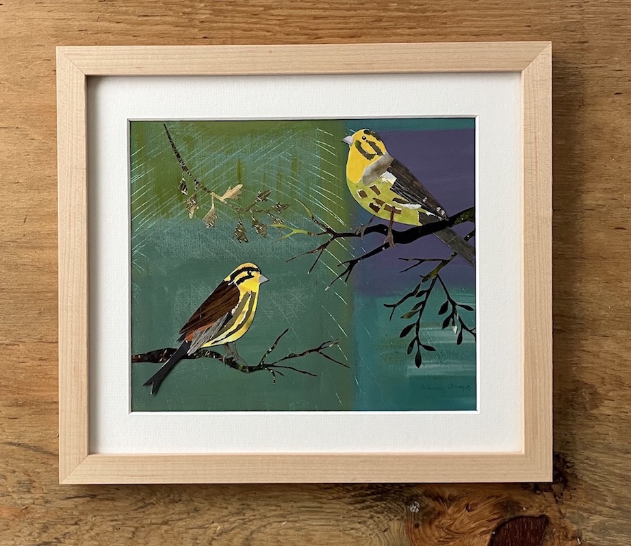 Yellow Hammer – collage and paint on paper in a light coloured wooden frame.
